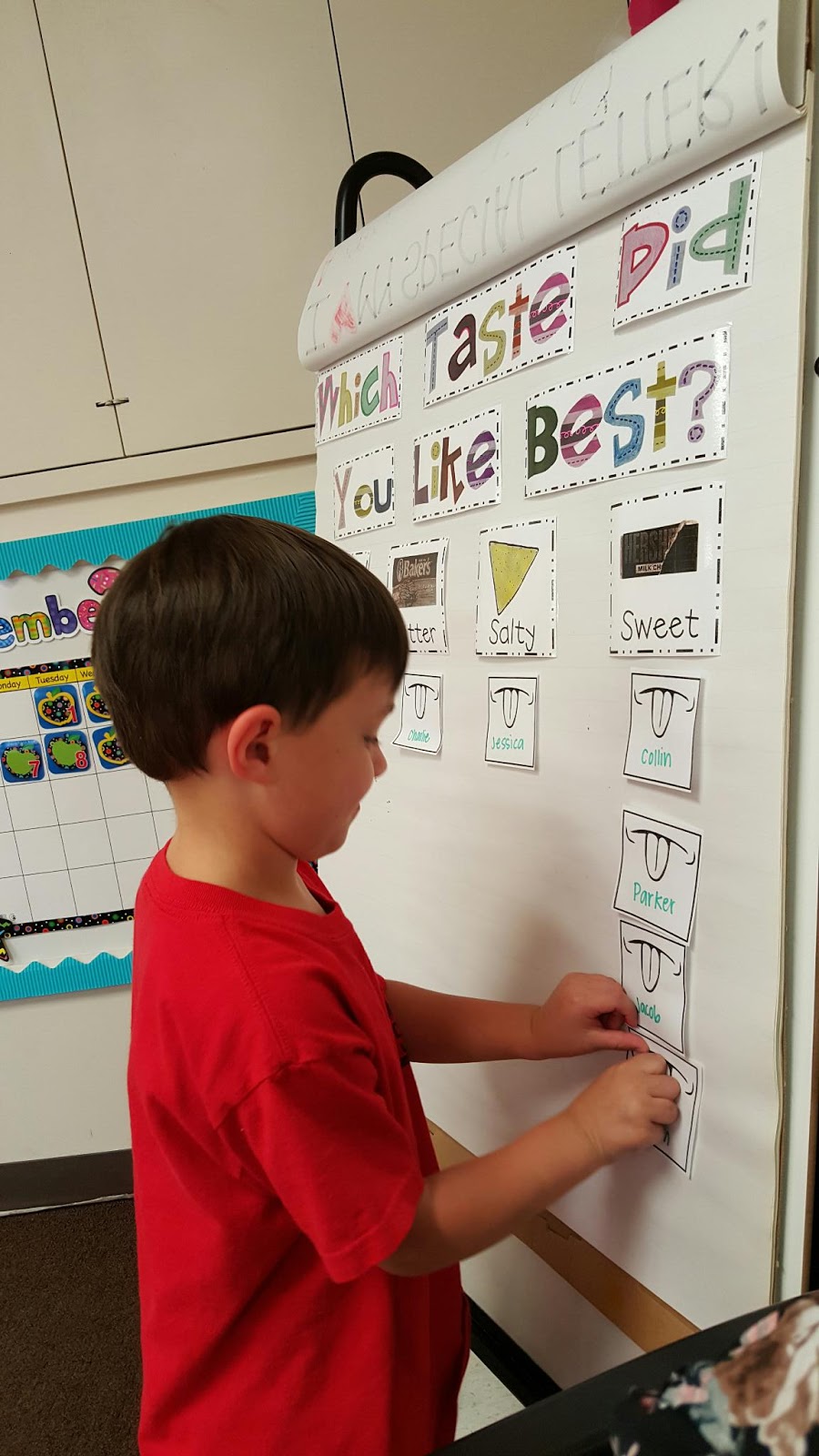 One afternoon we had a taste test! We tried sour gummies, bitter dark chocolate, salty crackers, and sweet milk chocolate. We kept track of our own likes and dislikes on our paper then we voted for our favorite taste as a class.